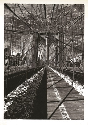 Net als Escher laat ze zich verwonderen door de wereld om haar heen met Italië altijd in het achterhoofd. Desmet wordt een geliefd kunstenaar en is benoemd tot 'Royal Academician'. Ze heeft tientallen onderscheidingen en prijzen gewonnen en haar werk is getoond in tentoonstellingen in het Verenigd Koninkrijk, Italië, Rusland en Brazilië. Een grote fascinatie van Anne Desmet is om te laten zien hoe het verleden en het heden elkaar beïnvloeden. Zo 'bouwt' ze vaak moderne steden bovenop ruïnes. "Ik wil een gevoel creëren van de verwevenheid en het verstrijken van jaren geschiedenis - een soort metamorfose die een overheersend thema is in mijn werk", zegt ze daar zelf over. Ze geeft haar prenten letterlijk en figuurlijk meerdere lagen: behalve het maken van prenten in oplage creëert ze ook collages door fragmenten uit haar gravures en linosneden te knippen, vouwen, scheuren, recyclen en combineren met andere materialen. Deze nieuwe afbeeldingen bestaan zowel op papier als digitaal. Haar werk verbindt heden en verleden met landmarks als de Brooklyn Bridge en de Manhattan skyline in New York City en tijdloze iconische gebouwen als het British Museum in Londen. Haar architecturale werken staan ook aan de basis van haar indrukwekkende caleidoscopische patronen. Naast een 40-tal prenten van Desmet is in de tentoonstelling in Escher in Het Paleis ook een selectie schetsboeken, houtblokken en gereedschappen te zien. De grote kracht van beide kunstenaars is de manier waarop ze hun voorstellingen opbouwen met licht vanuit het donker. In hun prenten zijn het ambacht en de precisie van de twee grafici duidelijk te herkennen. Het bewerken van een houtblok is een tijdrovend proces, waar veel geduld bij komt kijken. Het vervaardigen van een complex werk kan wel drie maanden in beslag nemen en het resultaat is elke keer weer een openbaring. Anne Desmet: "Het wit wat je op het papier ziet is wat ik in het hout graveer. Dat ik licht kan 'snijden' uit duisternis blijf ik het betoverende van mijn werk vinden." Anne Desmet – Bouwen zonder barrières, 20 november 2025 t/m 15 maart 2026, Escher in Het Paleis, Lange Voorhout 74, Den Haag. Website: www.escherinhetpaleis.nl.