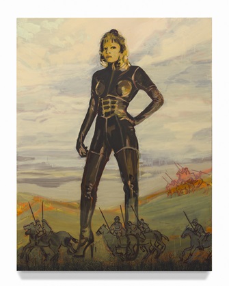 In dit tafereel rijst zij boven een slagveld met ridders te paard